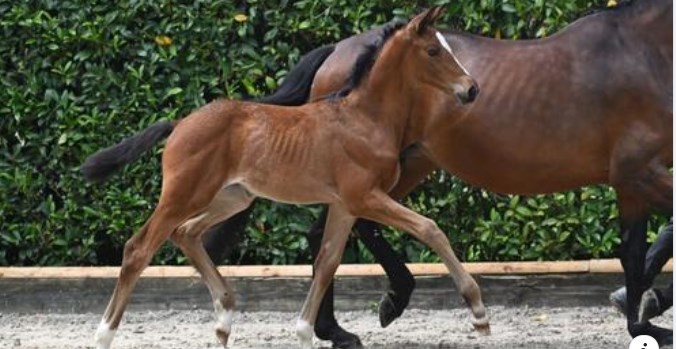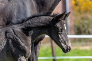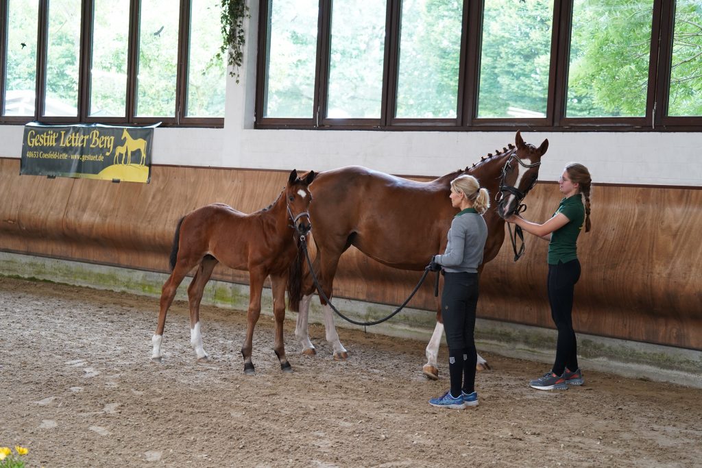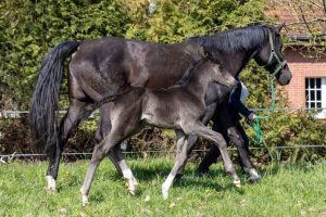 Auch in der Zucht zeigt Olymp bereits ein klares Vererbungsprofil. Er kann seine eigenen phänotypischen Eigenschaften mit erkennbarer Regelmäßigkeit an seine Nachkommen weitergeben. Neben der großzügigen und zugleich typvollen Gesamterscheinung lassen viele seiner Fohlen einen lockeren, modernen Bewegungsablauf erkennen, der von gutem Grundschwung und ansprechender Mechanik geprägt ist. Besonders hervorzuheben ist der qualitätsvolle Galopp, der bei vielen der gesichteten Fohlen vom Fleck weg konstant bergauf, balanciert und mit gefälligem Ablauf über Schulter und Vorderbein gezeigt wird. Zwei Trakehner Auktionsfohlen des Jahrgangs 2024 stehen exemplarisch für dieses Vererbungsprofil.